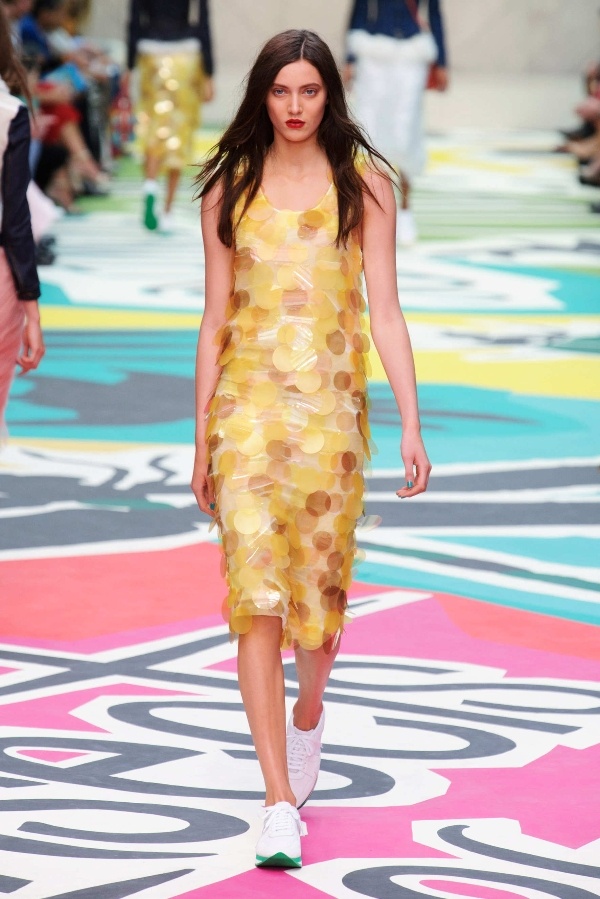 | Cảm hứng tổ ong được Giám đốc sáng tạo Christopher Bailey phát triển từ BST Resort 2015 thể hiện qua chi tiết kim sa to bản bằng chất liệu nhựa dẻo trong suốt xếp chồng lên nhau trên nền những mẫu thiết kế đầm dài ngang đầu gối, hoặc áo lửng được may dạng crop-top đầy gợi cảm. |
