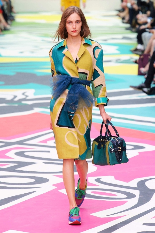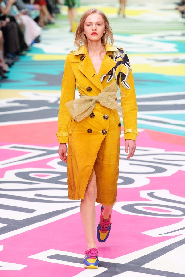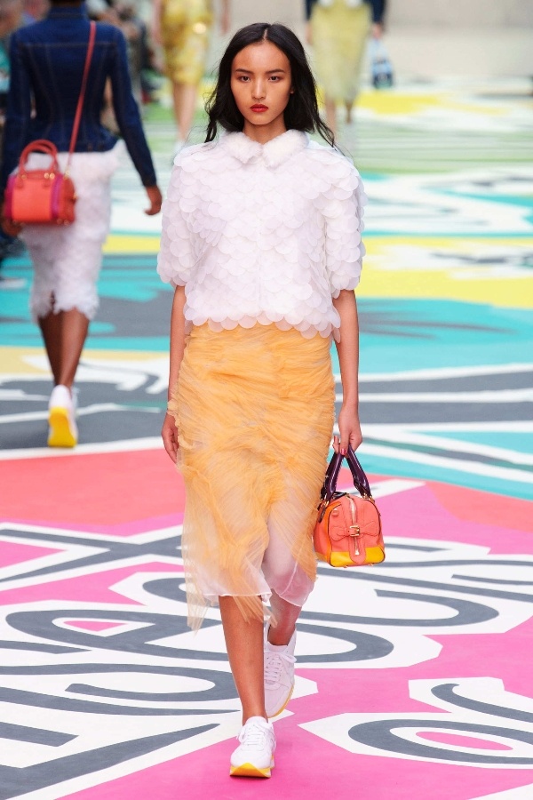 | Tiếp nối BST Resort 2015, kỹ thuật nhuộm dip-dyed (kỹ thuật nhuộm táo sắc độ đậm nhạt khác nhau) tiếp tục được NTK Christopher Bailey khai thác. Lựa chọn chất liệu nổi bật của BST Burberry Prorsum nữ xuân - hè 2015 là chất liệu vải tuyn được xử lý xếp pli rất nữ tính. Không chỉ hiện diện trên những mẫu chân váy, chất liệu vải tuyn còn được buộc thắt nơ tạo thành đai lưng Dragonfly Belts độc đáo. |