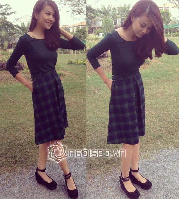 | Sử dụng tông màu rêu là điểm nhấn, Thanh Hằng có sự kết hợp rất nhuần nhuyễn giữa áo thun và chân váy kẻ cho ngày xuống phố. |