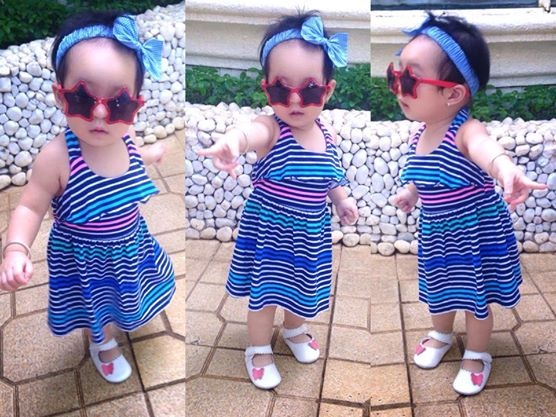 | Cô em gái của Rio - bé Cherry - cũng có nhiều kiểu kính phá cách với những hình mẫu khác nhau. Trong ảnh, cô nhóc thích thú khi được đeo kính ngôi sao cùng váy sọc kẻ dễ thương. |