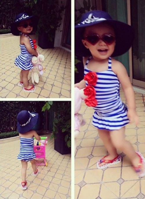 | Khi đi bơi, Luna được mẹ chuẩn bị trang phục rất chu đáo, cô nhóc diện đồ bơi sọc kẻ hợp mốt, mũ rộng vành và kính râm hình trái tim ấn tượng. |