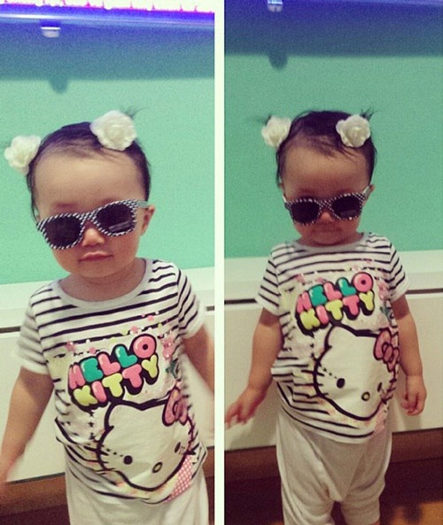 Ngoài ra, Luna còn đón đầu xu hướng với mốt kính ca-rô. Nhóc tỳ không tách rời kính râm khi xuống phố, đi bơi... cùng mẹ.