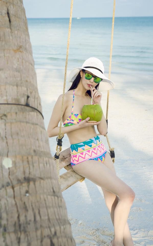 | Thời trang bikini duyên dáng cùng mẫu mũ rộng vành trắng đơn giản, dịu dàng. |