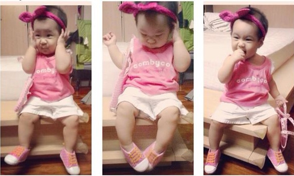 | Vẻ đáng yêu, tinh nghịch của Cherry khi được mẹ chụp ảnh. Công chúa nhỏ diện trang phục và phụ kiện gam hồng ngọt ngào. |