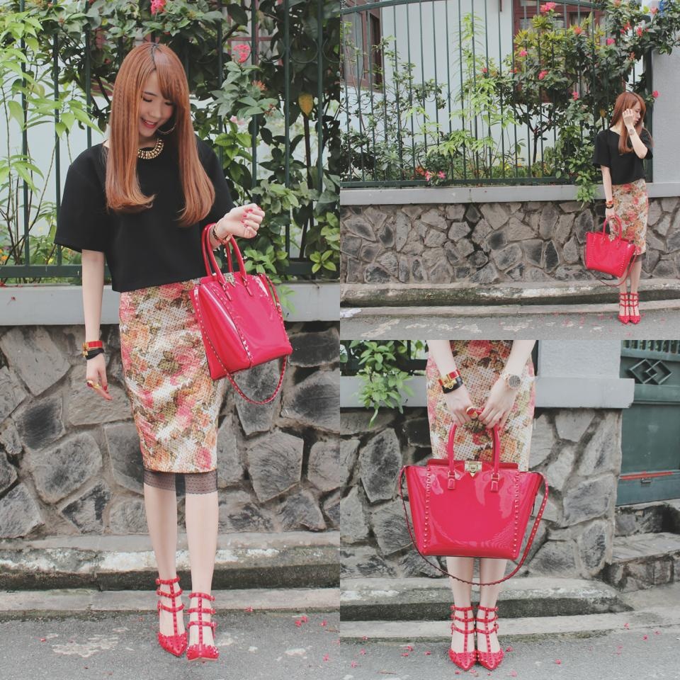 Mẫu túi cá tính của Valentino (có giá bán là 2.145 USD) mix hợp tông cùng giày và chân váy họa tiết.
