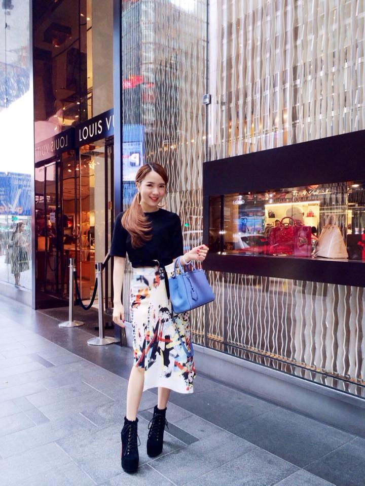 Túi Fendi tông màu xanh trị giá được mix phù hợp với bộ cánh tông màu trắng đen, chân váy có họa tiết lạ mắt.