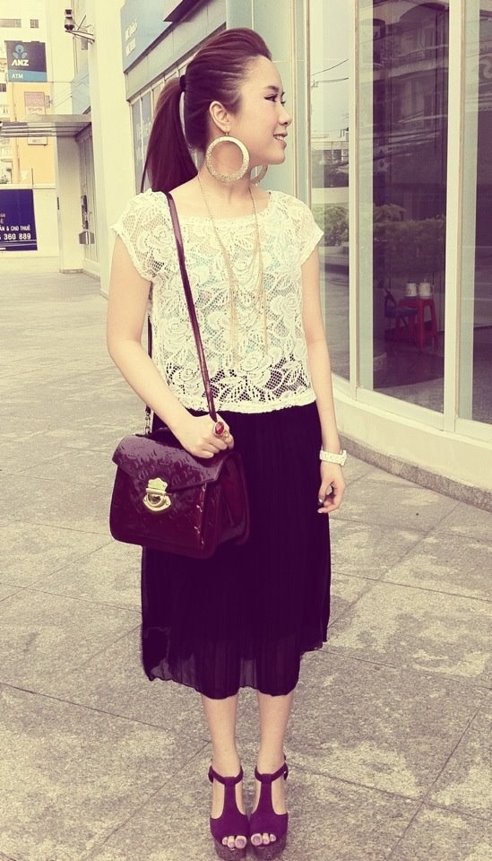 Kiểu túi LV tông màu tím mận tiệp màu cùng trang phục.
