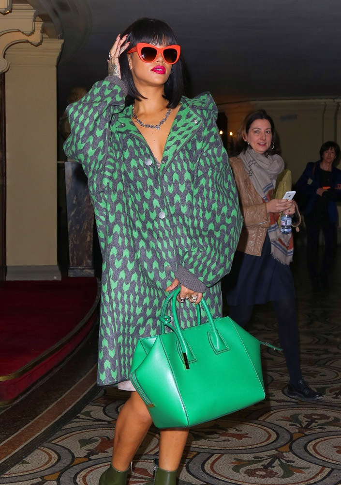 | Mẫu túi xanh độc đáo của Stella McCartney giúp Rihanna khẳng định cá tính có giá 1.435 đôla. |