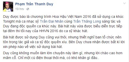 Tối 12/6, sau khi đêm chung khảo phía Nam cuộc thi Hoa hậu Việt Nam 2016 diễn ra tại nhà hát Hòa Bình (TP HCM) kết thúc, hai nam ca sĩ Thanh Duy và Đại Nhân bất ngờ bày tỏ sự bất bình trên trang cá nhân về việc ban tổ chức chương trình đã vi phạm tác quyền ca khúc Tonight. Đây là sáng tác của Đại Nhân và người bạn thân Thăng Long, được thể hiện cũng như thuộc quyền sở hữu của ca sĩ Thanh Duy. Trong chương trình, bài hát này được Song Luân, Trương Nam Thành, Tùng Lâm trình diễn trong phần trình diễn áo tắm của các thí sinh.