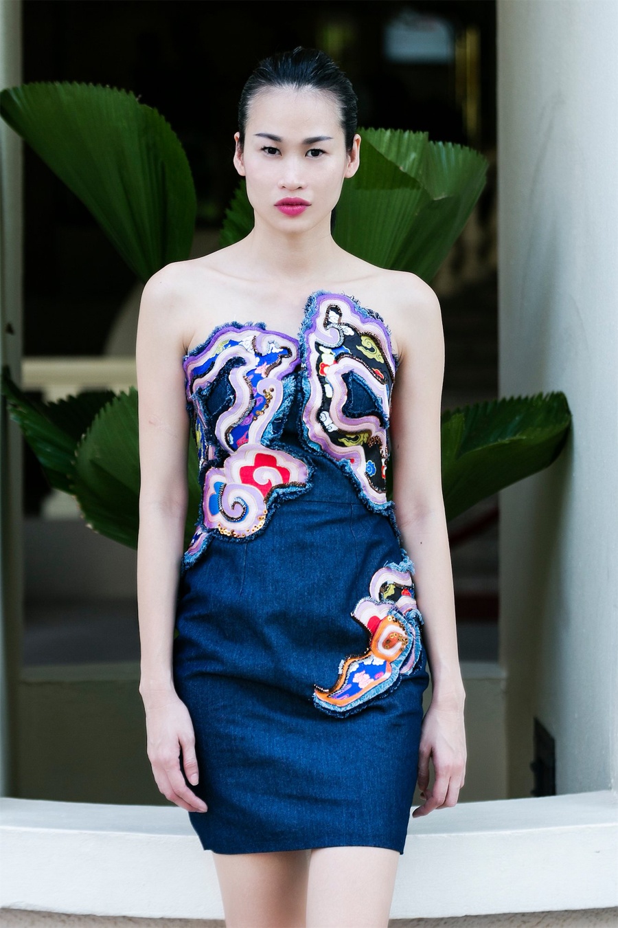 Một trong những thiết kế thể hiện ý đồ của nhà tạo mốt rõ ràng nhất. Váy quây chất denim được phối họa tiết mây làm bằng gấm rất sáng tạo, đính nổi trên thân váy.