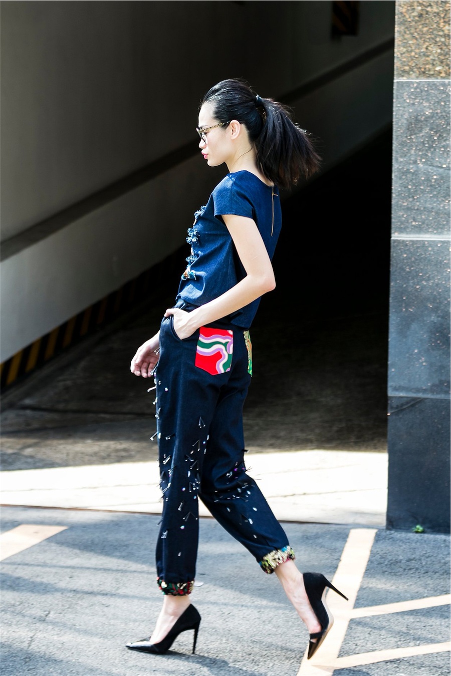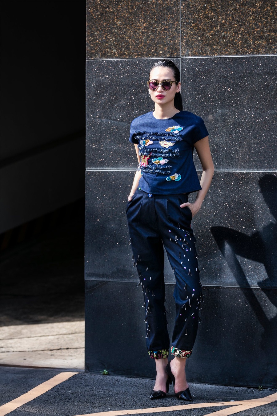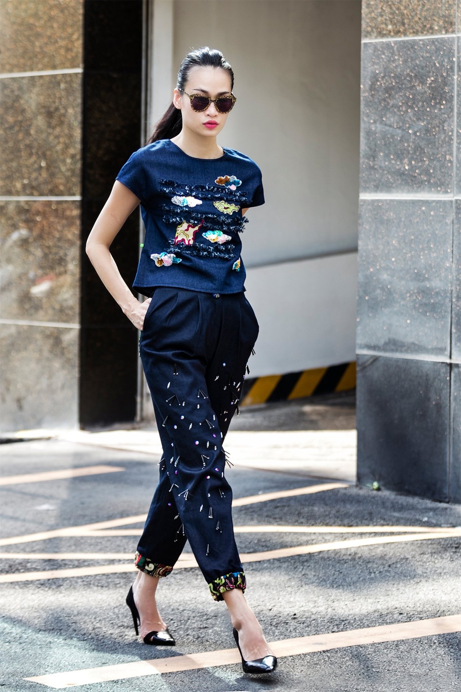 Nữ tín đồ thời trang đình đám Sài thành xuống phố với set đồ phối chất liệu gấm, denim lạ mắt và không kém phần cổ điển.