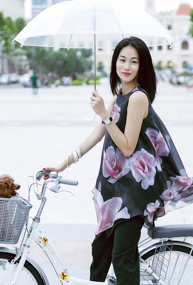 | Họa tiết hoa mùa hè nổi bật trên nền trang phục đen tuyền, mang lại vẻ thanh lịch, huyền bí cho Thanh Trúc. Người đẹp cho biết, cô thấy thoải mái khi diện áo dáng suông, quần âu dạo phố bằng xe đạp. |