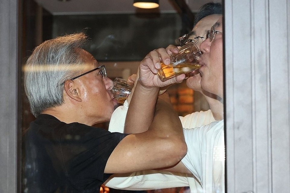 Các bức ảnh ghi lại cảnh Jensen Huang hứng thú với “soju tower”, Lee Jae-yong trực tiếp hướng dẫn cách pha “somaek”, hay khoảnh khắc cả ba cùng “love shot” đã trở thành meme lan truyền khắp mạng.