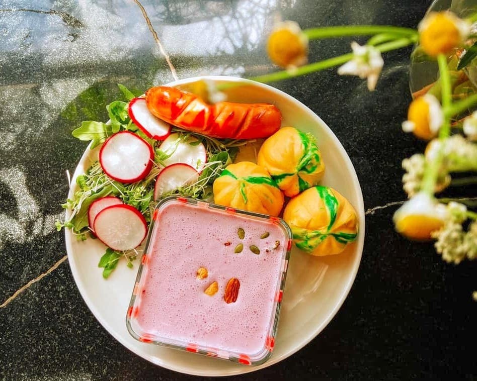 Bữa sáng thoạt nhìn có vẻ cầu kỳ song lại khá dễ chuẩn bị. Bánh bao bí đỏ cho vào xửng hấp, xúc xích khứa nhẹ cho vào lò nướng, rau rửa sạch và 1 bát smoothie mâm xôi đen trộn cùng chút hạt tổng hợp.