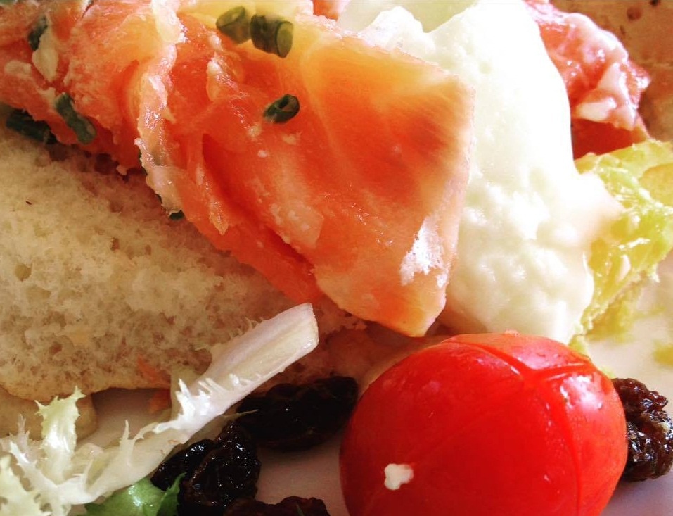 | Thành phẩm của món trứng đánh cá hồi xông khói và bánh mì hạt khô. |