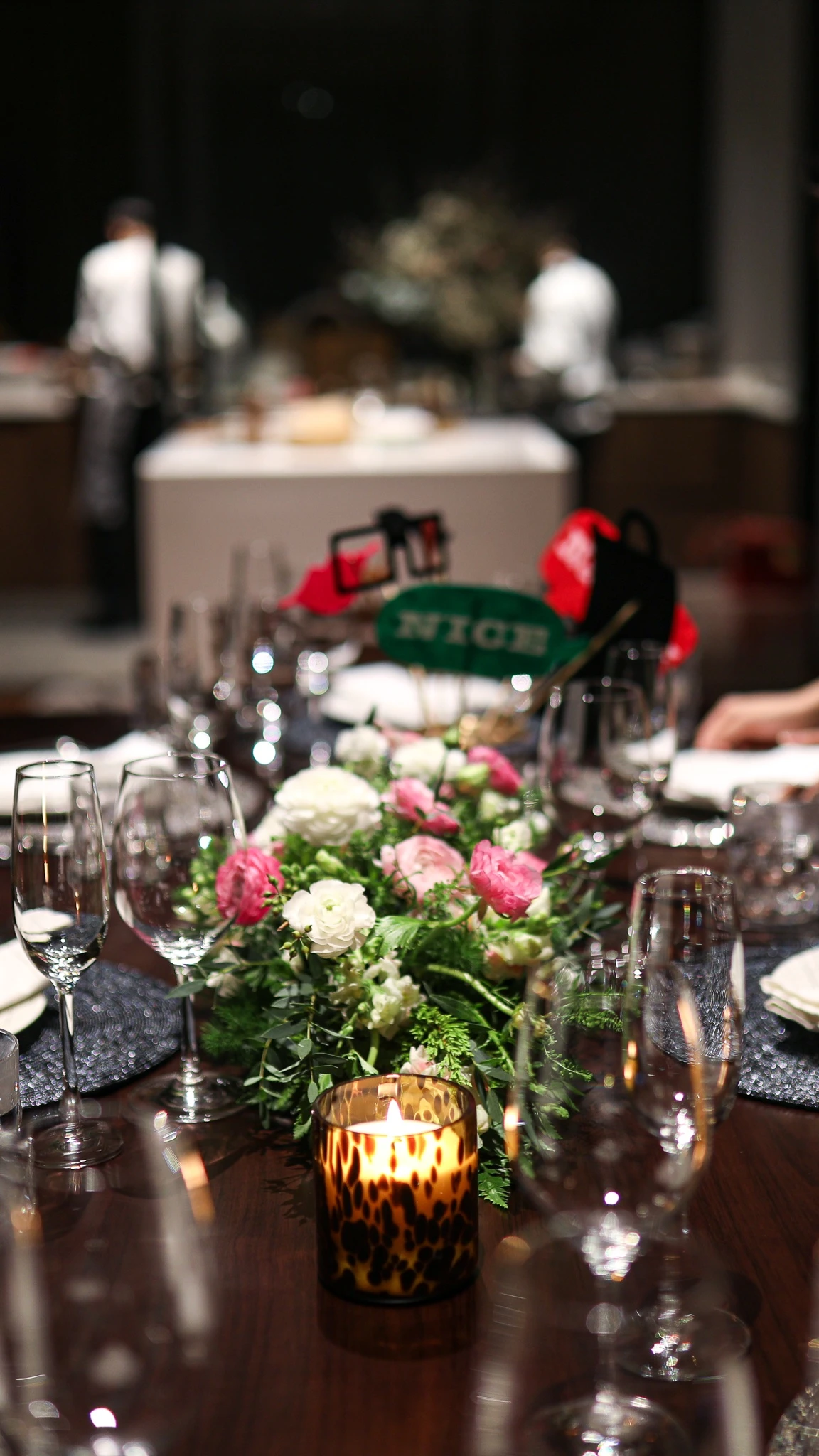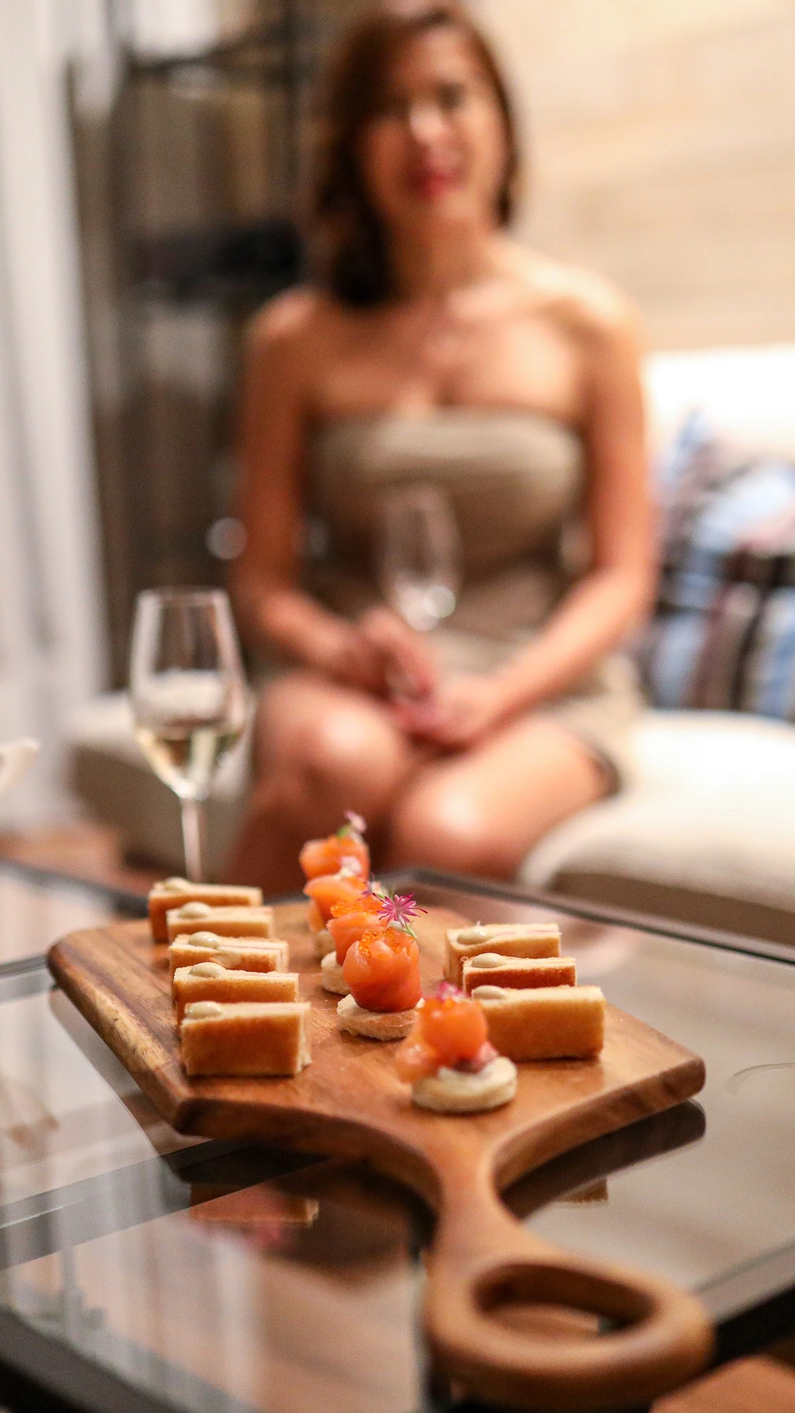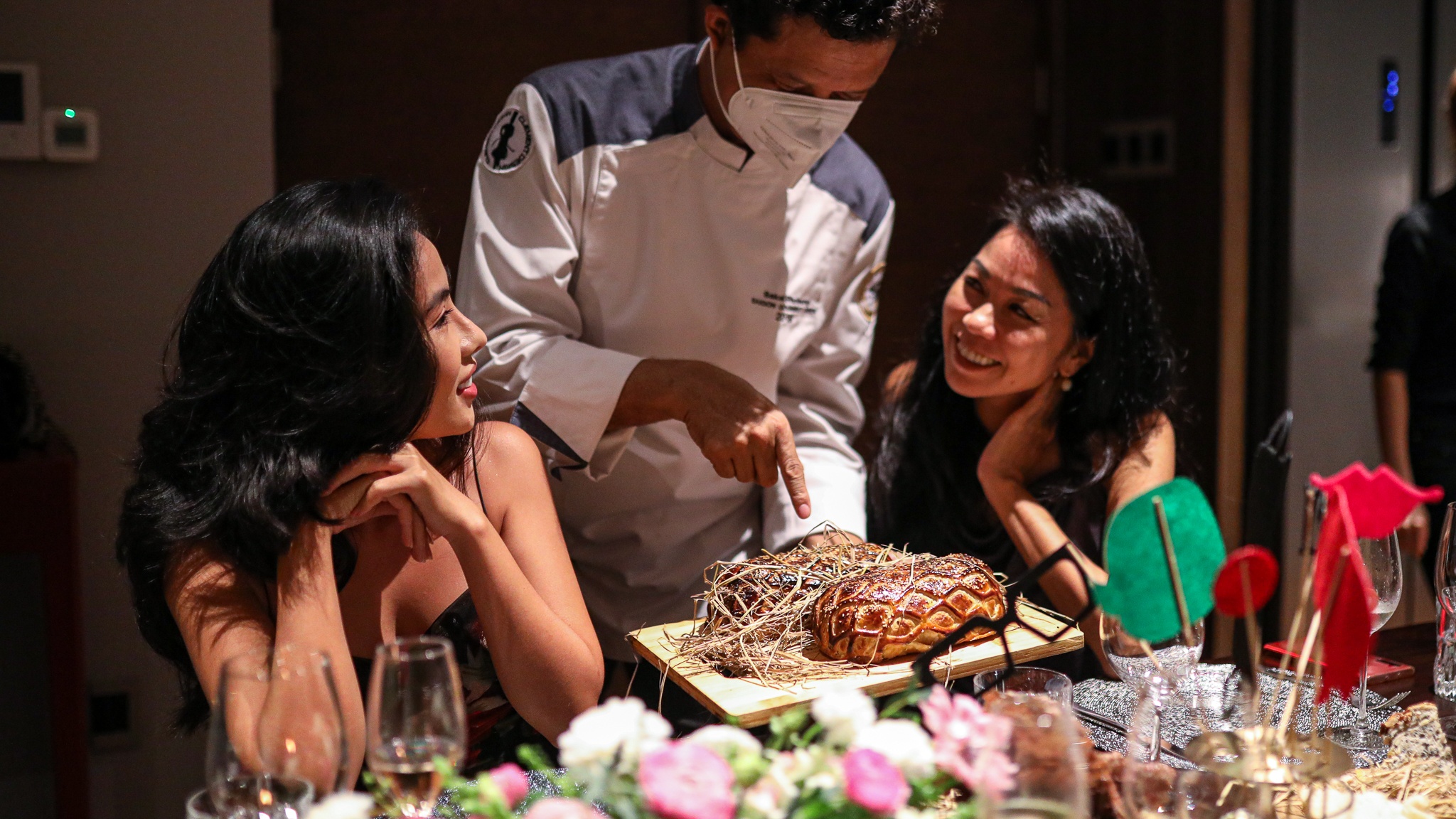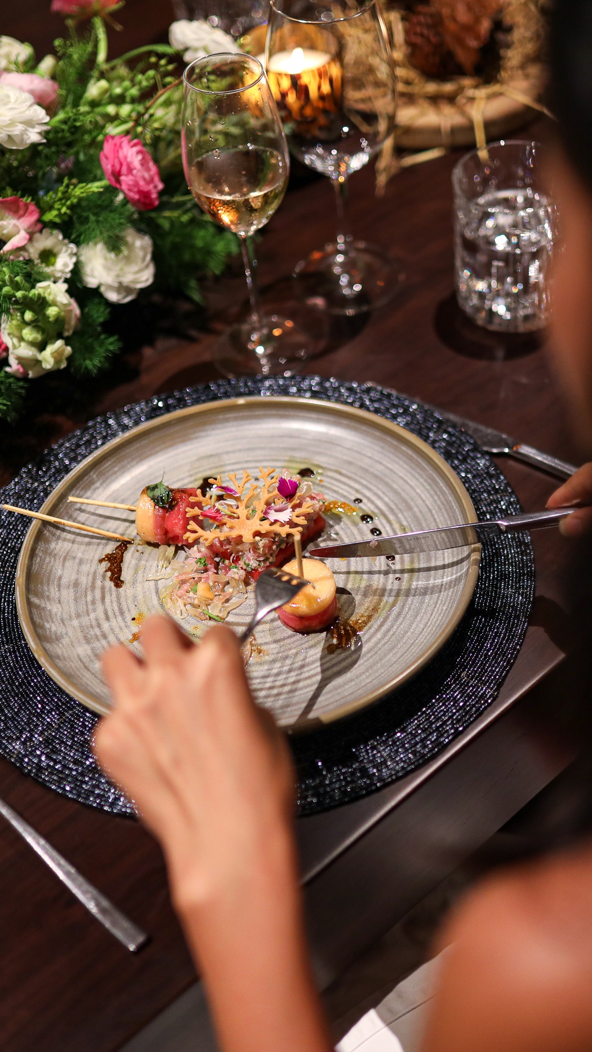 | Buổi tiệc gồm 5 món. Khai vị (canapes) gồm 2 loại bánh rice cracker và croque monsieur. Món mở màn tiệc là cá ngừ tươi ăn kèm trái cây. "Ngôi sao" của buổi tiệc là món bò Wellington ăn kèm gan ngỗng và cà rốt baby. Tráng miệng có bánh tart chanh. Giá mỗi phần/khách là 1.290.000 đồng |