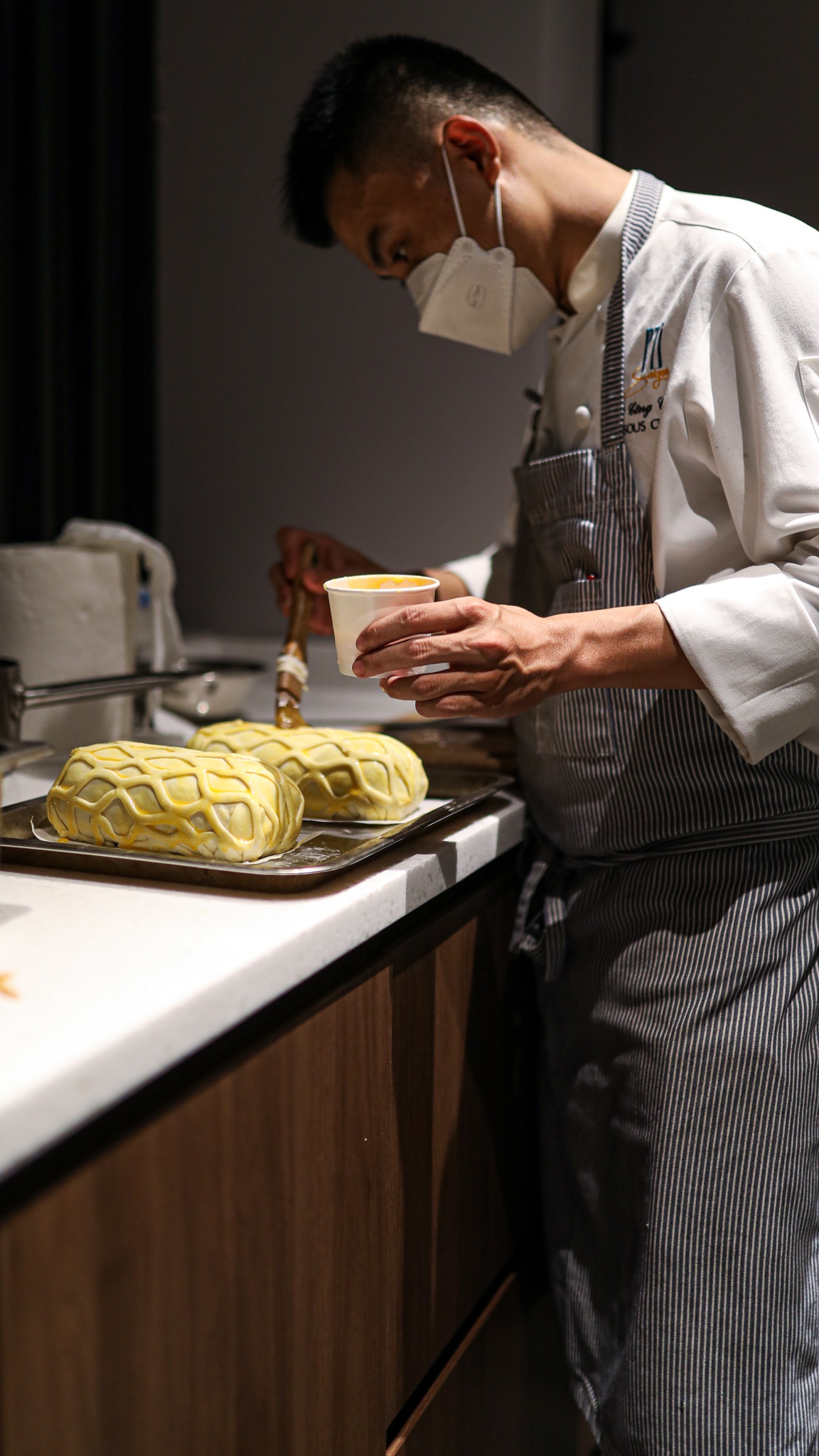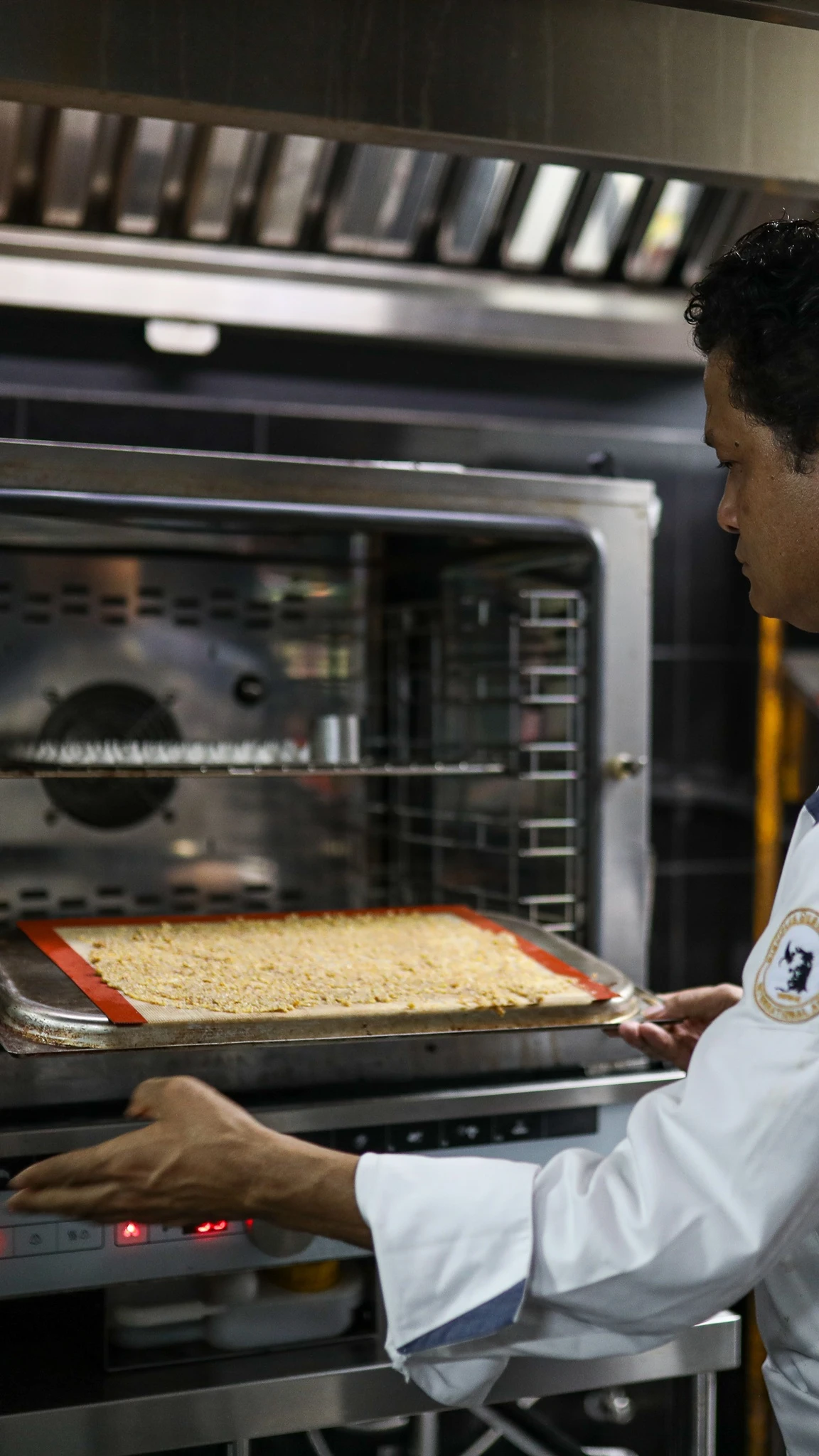 | Bữa tiệc tối nay khá nhỏ gọn, không cần nhiều công đoạn phức tạp. Tôi và các phụ bếp sơ chế nhanh vài món tại bếp nhà hàng và nấu trực tiếp tại nhà khách để món ăn được phục vụ nóng hổi. Tôi đang chuẩn bị món khai vị rice cracker (bánh gạo nướng) gồm hỗn hợp gạo lứt, nước dùng gà, gừng, gia vị cà ri, nướng ở nhiệt độ 170 độ C trong 25 phút. |