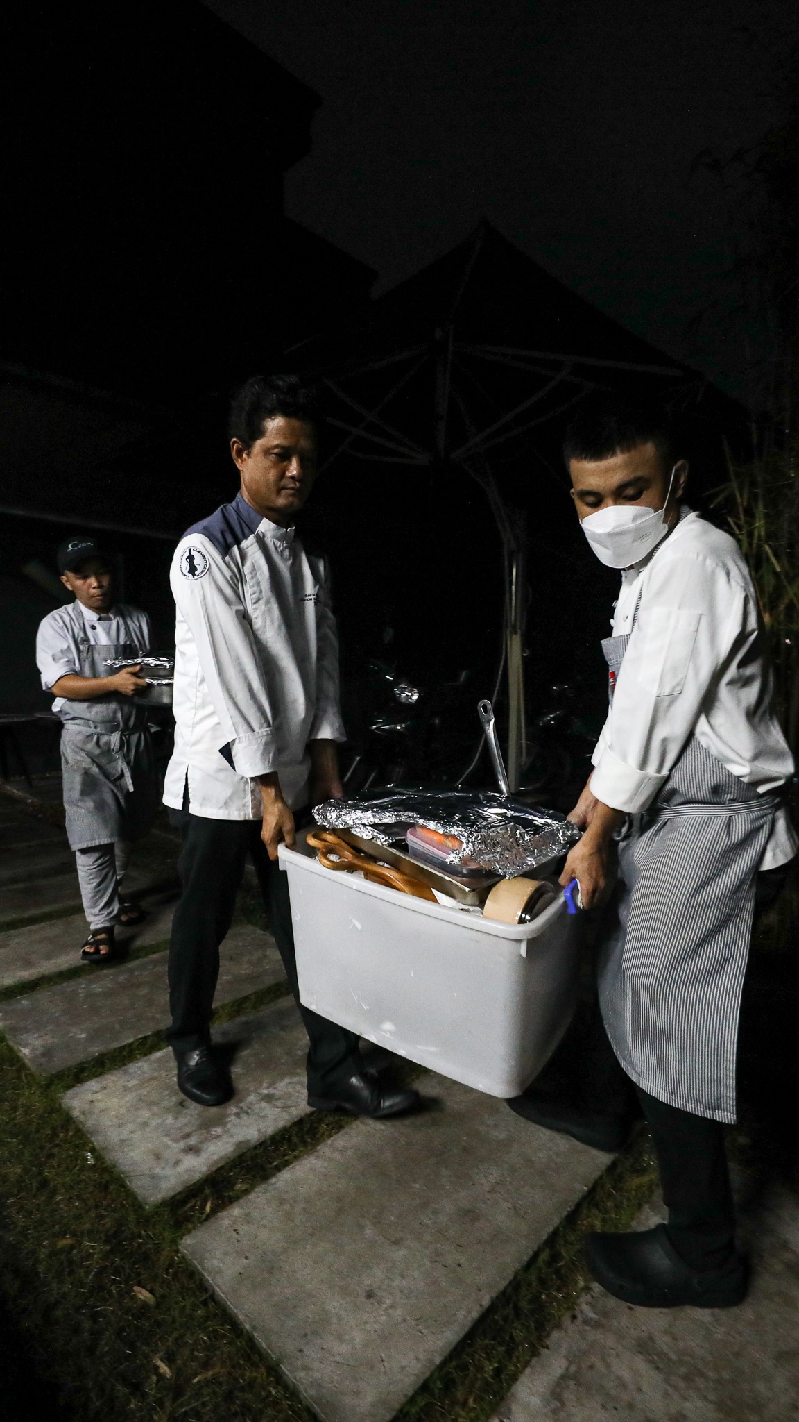 | Đồng hồ điểm 18h, tôi và nhân viên bắt đầu gói ghém đồ ăn đã sơ chế và dụng cụ bếp như chảo, xoong, khay gỗ, dao… Đồ ăn được đựng trong khay, bọc giấy bạc và trực tiếp bưng bê cẩn thận suốt quá trình vận chuyển từ nhà hàng qua nhà khách. |