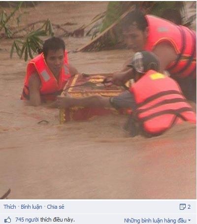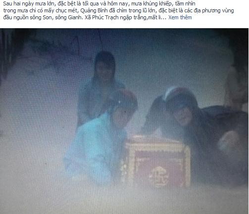 Một bức ảnh khác được nhà văn Nguyễn Quang Vinh chụp lại, chia sẻ lên trang cá nhân, nhận được 622 lượt like (thích). Bức ảnh là cảnh đưa quan tài đi tránh lũ của gia đình có 2 người bị chết do lốc xoáy ở Quảng Sơn, H.Quảng Trạch, Quảng Bình.