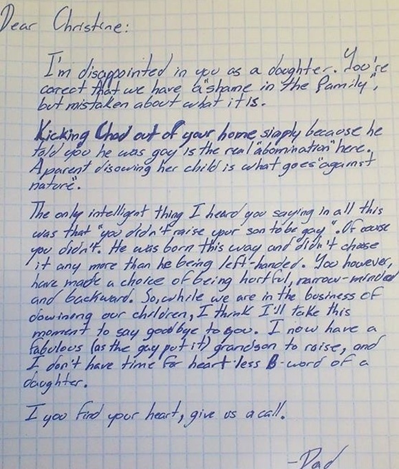 Cha rất thất vọng khi có một người con gái như con. Có thể con đã đúng khi nói rằng trong gia đình ta có một điều “đáng xấu hổ”, nhưng con đã không đúng khi cho rằng điều đáng xấu hổ ấy là con trai con. Việc đuổi Chad ra khỏi nhà chỉ vì thằng bé là đồng tính là một việc làm thất đức con ạ! Bởi làm sao con có thể bắt nó thay đổi cái điều mà tạo hóa đã ban cho nó cơ chứ.