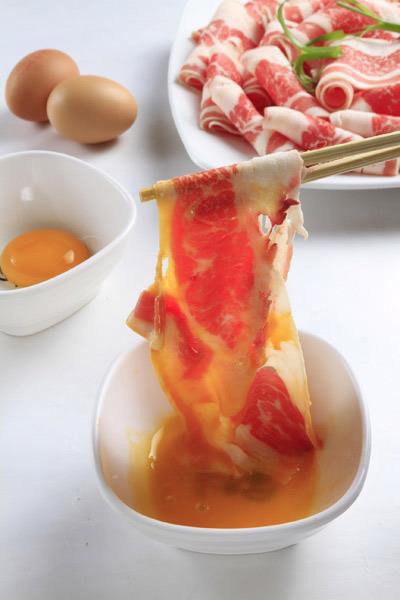 | Thịt bò Mỹ nhúng trứng tươi trong món lẩu Sukiyaki tại nhà hàng buffet lẩu Nhật Gyu Jin. |