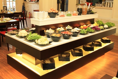 Một điểm độc đáo nữa khiến Gyu Jin khác biệt với những nhà hàng Nhật khác chính là món lẩu được phục vụ theo phong cách buffet. Thịt bò Mỹ và các loại nấm, hải sản, rau củ quả luôn được phục vụ không giới hạn. Gia vị tại đây được sắp xếp trên quầy bar sang trọng để khách thoải mái lựa chọn theo khẩu vị của mình. Nhân viên Gyu Jin cũng vô cùng nhiệt tình hướng dẫn khách cách thưởng thức các món lẩu sao cho đúng điệu Nhật Bản nhất.