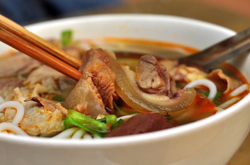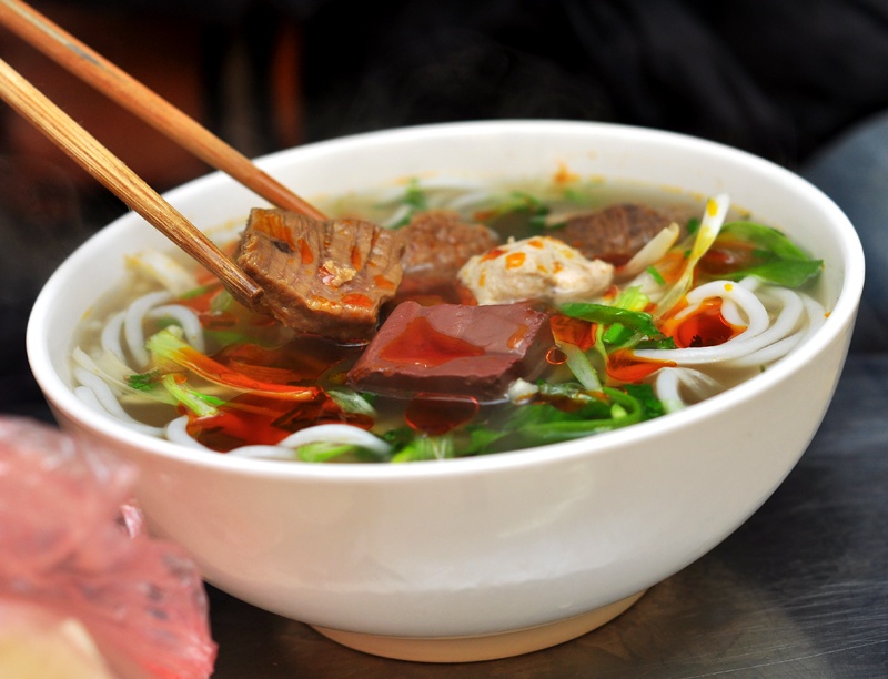 Ở đây, bạn có thể gọi bát thập cẩm hoặc tô bún kèm bất kì món nào mình thích. Bao giờ cô chủ quán cũng hỏi khách “có ăn cay hay không?” để gia giảm cho vừa miệng. Nếu gật đầu thì bán bún của bạn bưng ra sẽ thấy ngay độ cay nóng. Nước canh tỏa khói thơm lừng, gợn lên những váng đỏ óng như nước sa tế, vừa hấp dẫn vừa khiến khách nhìn đã muốn xuýt xoa. Quả thật, nước canh nơi này chế biến không chỉ thơm mà còn rất đậm đà, đúng hương vị miền Trung Nam Bộ. Nếu ghiền ẩm thực xứ này, phải lúc đang đói với rét, húp thìa canh ấy thôi thì bạn thấy ấm bụng, thích thú liền.