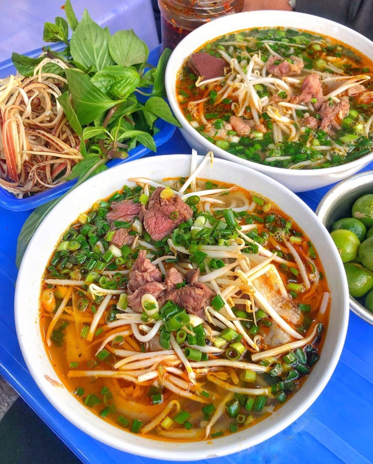 Một tô bún bò Huế thường gồm giò heo, thịt bò, chả cua và huyết. Bạn có thể thưởng thức món ăn kèm rau sống và nước mắm ớt hấp dẫn. Ngày nay, bún bò giò heo phổ biến khắp mọi miền Việt Nam, song dường như chỉ có bún bò ở Huế mới giữ hương vị tinh túy đúng điệu. Ảnh: Mokhoet_hanoi. |