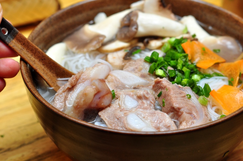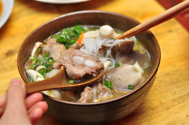 Bát bún mới nhìn qua đã thấy chất – sườn nhiều, miếng nào cũng thớ thịt dày mà sụn thì non, nhai giòn sần sật; đảm bảo đủ lượng đạm cho buổi làm việc chiều của bạn sau đó. Nấm cũng “đông đúc” không kém, có thể thỏa miệng cho người mê các món nấm. Nước canh khá thú vị – trong veo, thanh thanh, thoang thoảng hương nấm tươi. Tuy nhiên, ai quen ăn đậm đà sẽ thấy hơi “nhạt miệng”, phải cho thêm gia vị, mì chính, còn với người quen khẩu vị vừa phải chắc chắn sẽ rất thích.