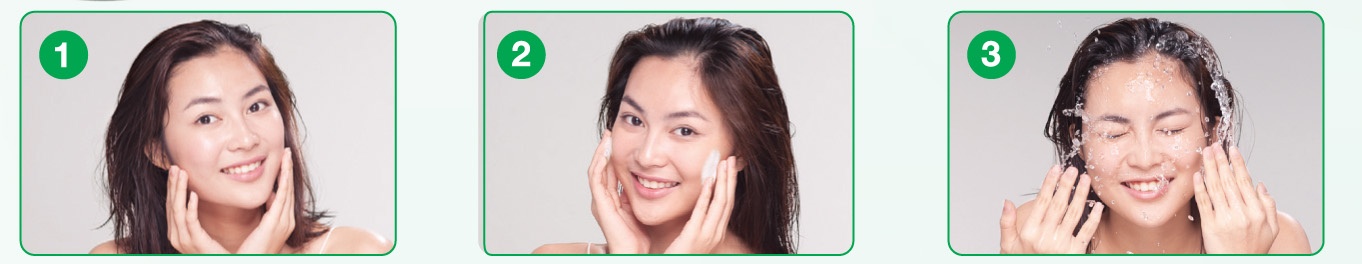 | Làm ướt mặt, lấy một lượng vừa đủ vào lòng bàn tay. Sau đó tạo bọt và thoa đều lên khắp mặt. Cuối cùng rửa mặt sạch với nước. |