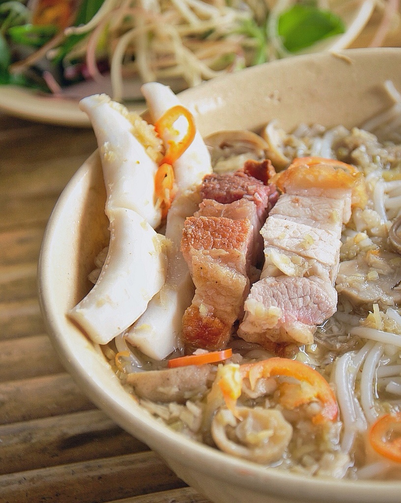Tô bún nước lèo Sóc Trăng đúng điệu phải có cá lóc luộc, đã bỏ hết xương, tôm tươi lột vỏ, thịt heo quay cắt thành từng miếng và mực tươi thái con chì. |