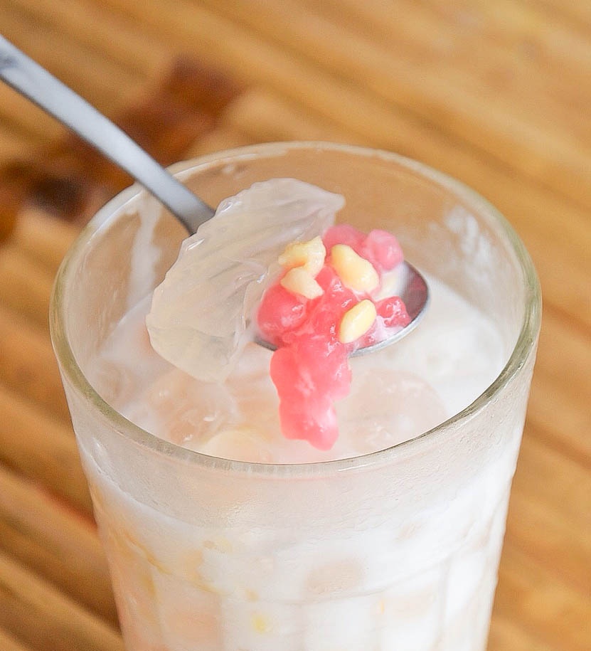 | Sương sa hột lựu với những miếng thạch sương sa giòn rụm do được nấu hoàn toàn bằng rau chân vịt. |