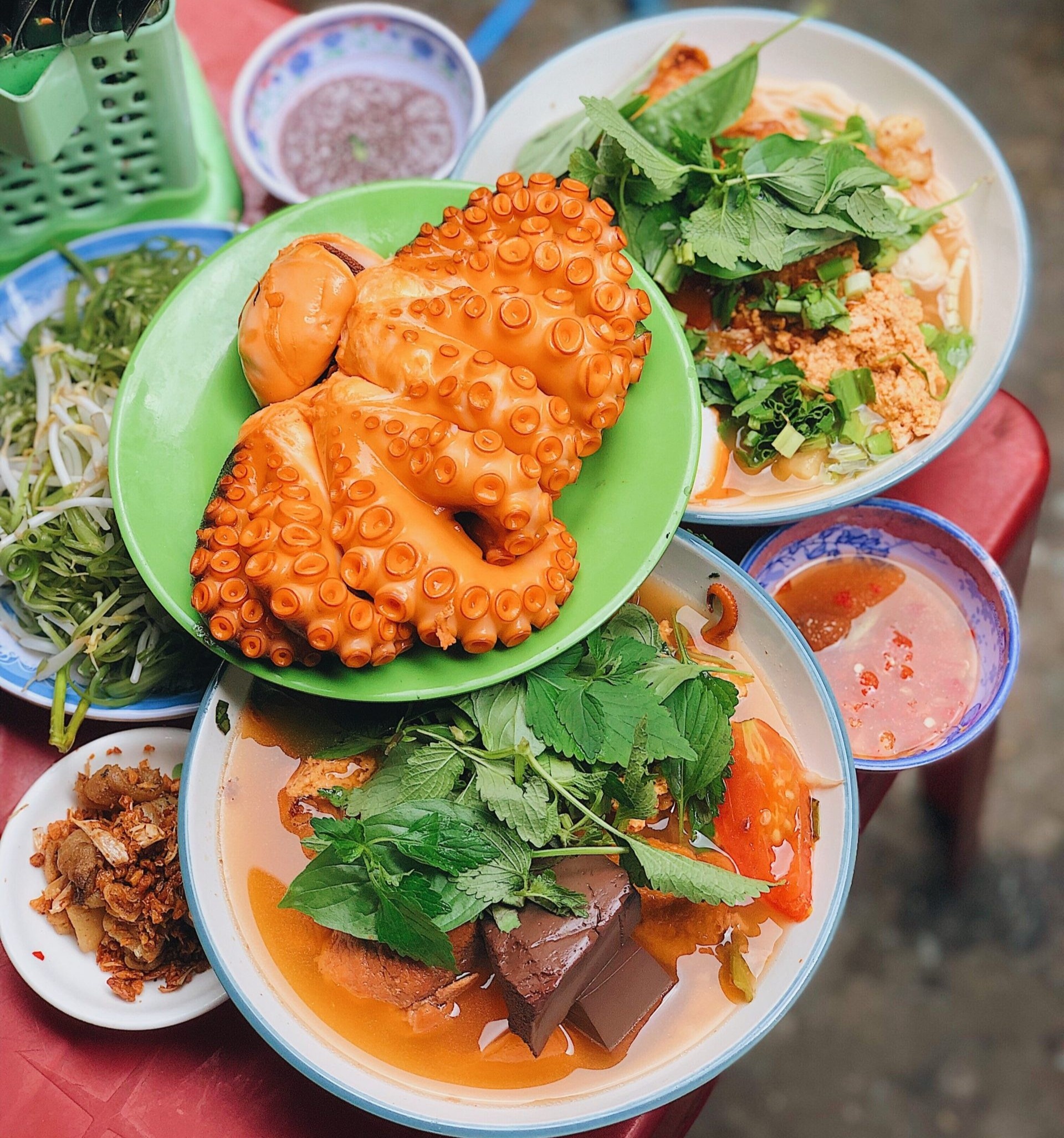 | Tại TP.HCM, bạn cũng có thể thưởng thức món ăn nổi tiếng này. Bún riêu ở miền Nam đa phần được biến tấu với các nguyên liệu phong phú. Trong đó, bún riêu bạch tuộc là phiên bản ẩm thực hấp dẫn không kém các hương vị thông thường. Điểm nhấn của món là phần bạch tuộc được nấu với nước canh bún tạo màu cam bắt mắt. Ảnh: Foodholicvn. |