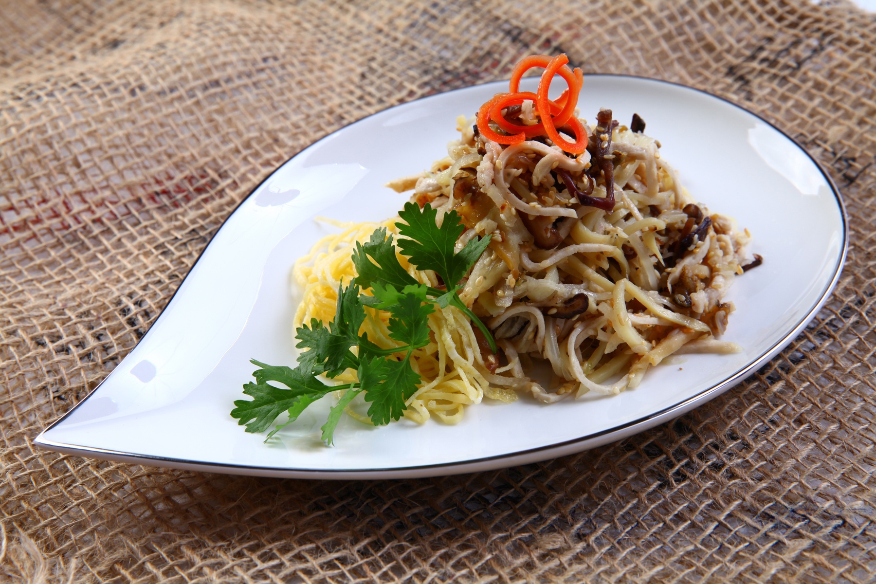 Cho phần bún vừa trộn ra đĩa, để trứng xắt sợi lên trên (bạn cũng có thể trộn trứng xắt sợi chung với các nguyên liệu khác ở bước trên). Rải mè lên trên.