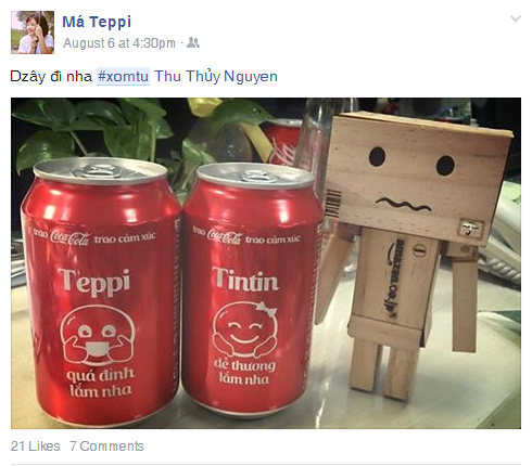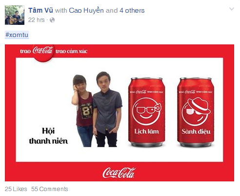 | Những lon Coca-Cola in tên riêng và biểu tượng cảm xúc mang đậm dấu ấn cá nhân độc đáo luôn hút nhiều lượt thích và bình luận khi được chia sẻ trên Facebook. |