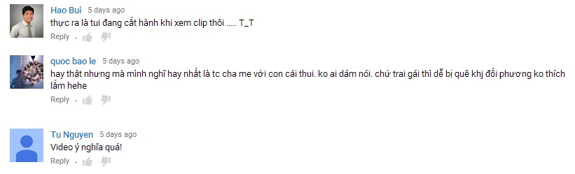 | Một comment hóm hỉnh trên Youtube chứng tỏ clip đã lấy đi không ít nước mắt người xem: “Thực ra là tui đang cắt hành khi xem clip thôi”. |