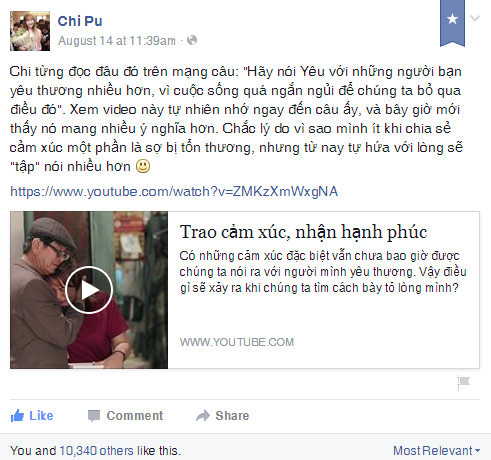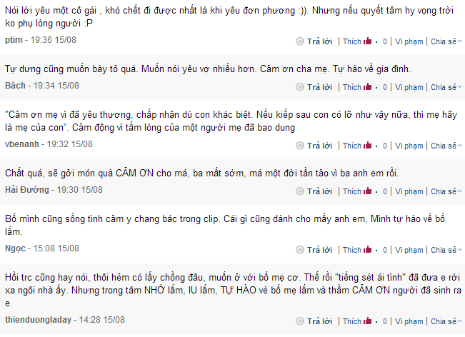 | Rất nhiều người có thêm động lực để giãi bày những cảm xúc sâu kín nhờ đoạn clip. Nhớ bố, nhớ mẹ, thấy yêu thương gia đình, chồng vợ là những tâm trạng được thú nhận nhiều nhất. |