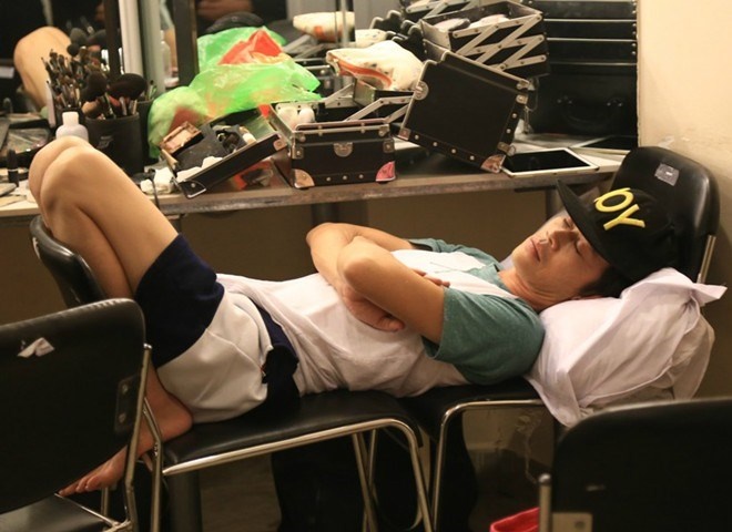 Hoài Linh nhiều lúc mệt, nằm ngủ tại trường quay. |