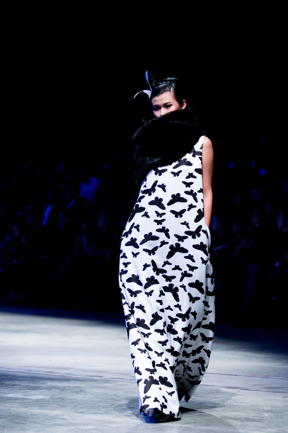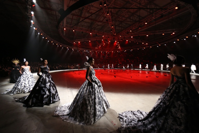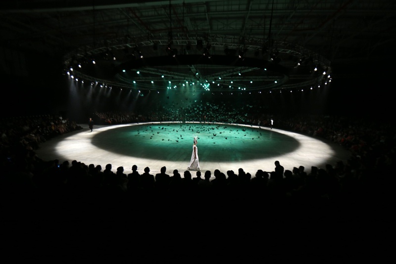 Không gian sân khấu tạo được ấn tượng ngay từ lúc mở màn. Dàn mẫu trình diễn với sàn catwlk hình tròn, ở giữa đặt những cánh bướm tựa như một đàn bướm rất sống động. |