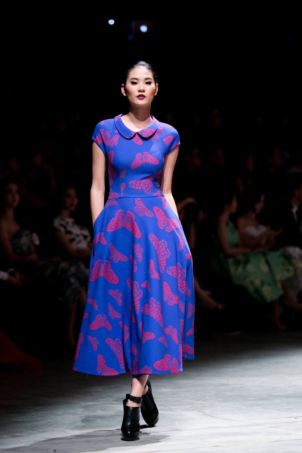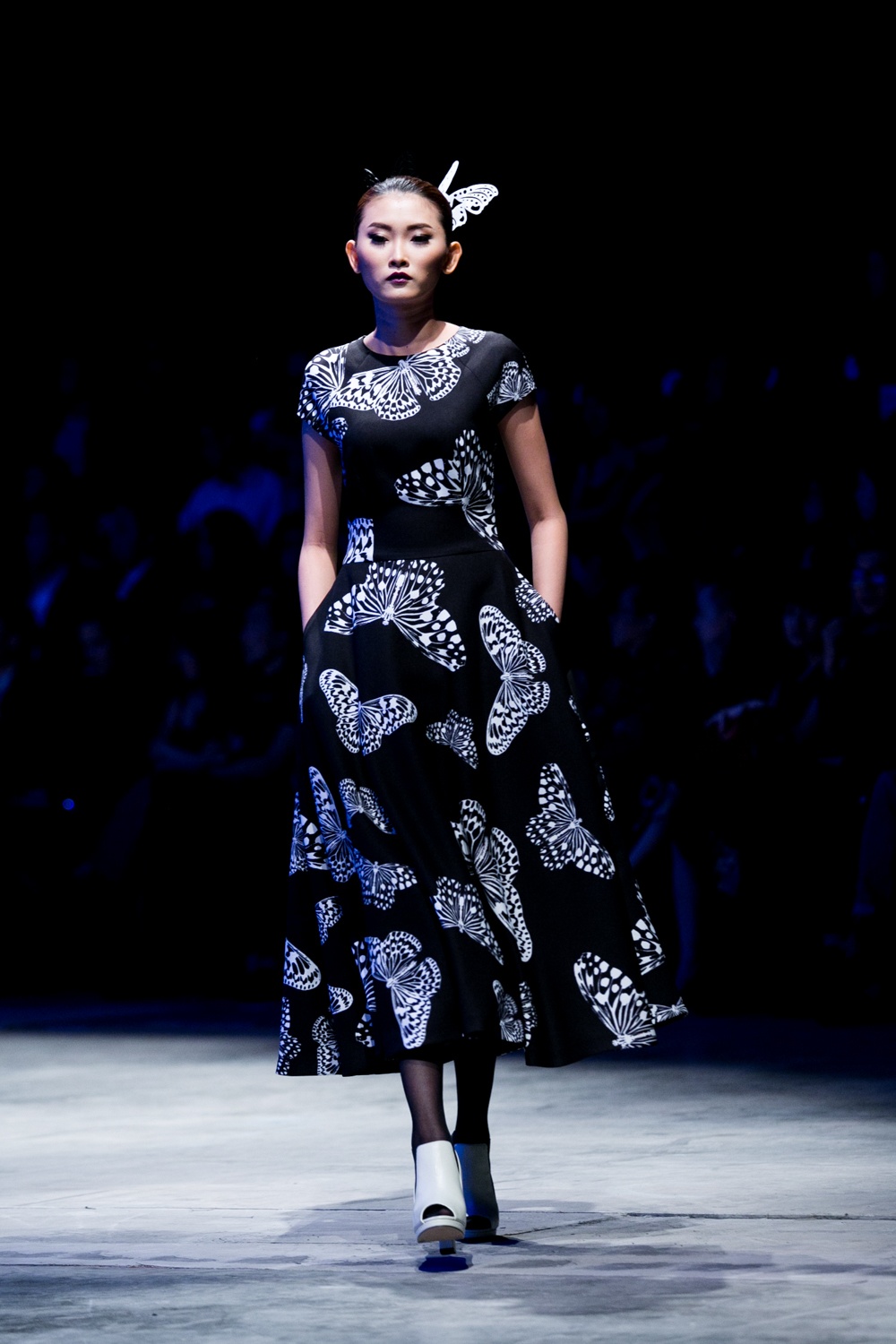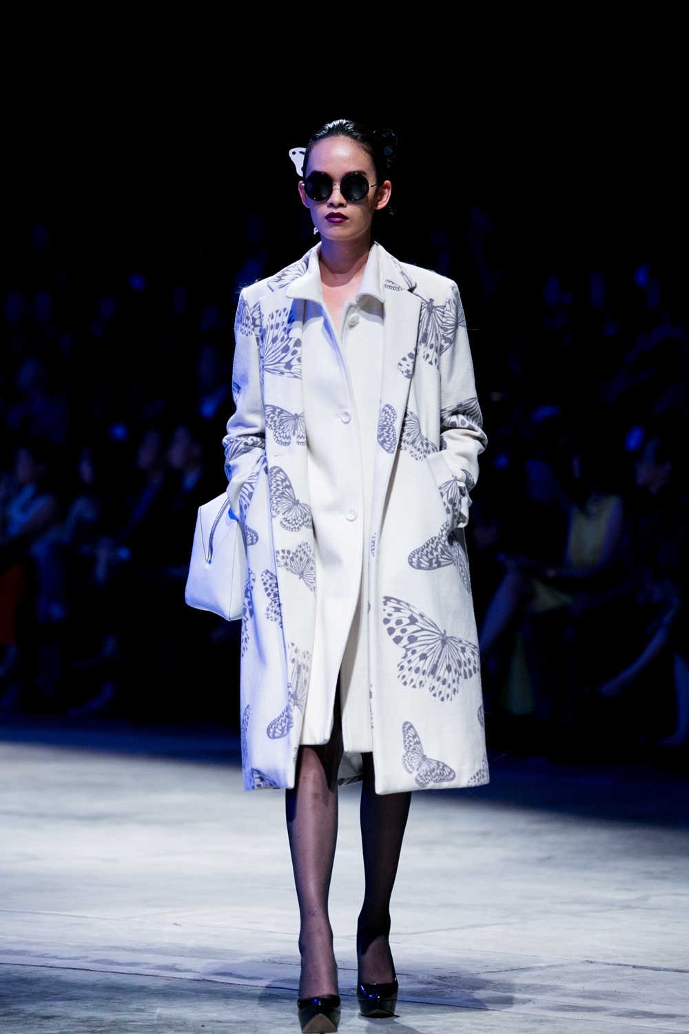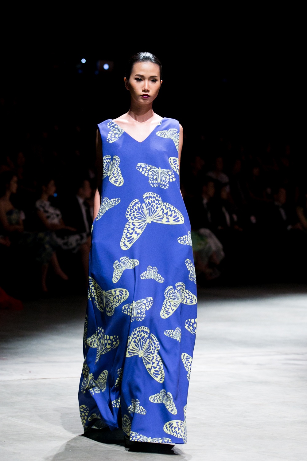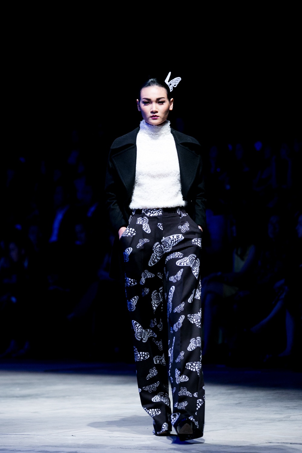BST có sắc màu tươi trẻ được giới thiệu ở phần đầu khá ấn tượng với những mẫu váy thanh thoát, họa tiết bướm được xếp đặt có ý tứ trên từng mẫu váy có sự linh hoạt về màu sắc, tạo sự hài hòa cho từng mẫu thiết kế. Ngoài ra, phụ kiện giày, mũ, túi xách góp phần tô điểm cho BST có hơi thở mùa thu đông phương Nam.