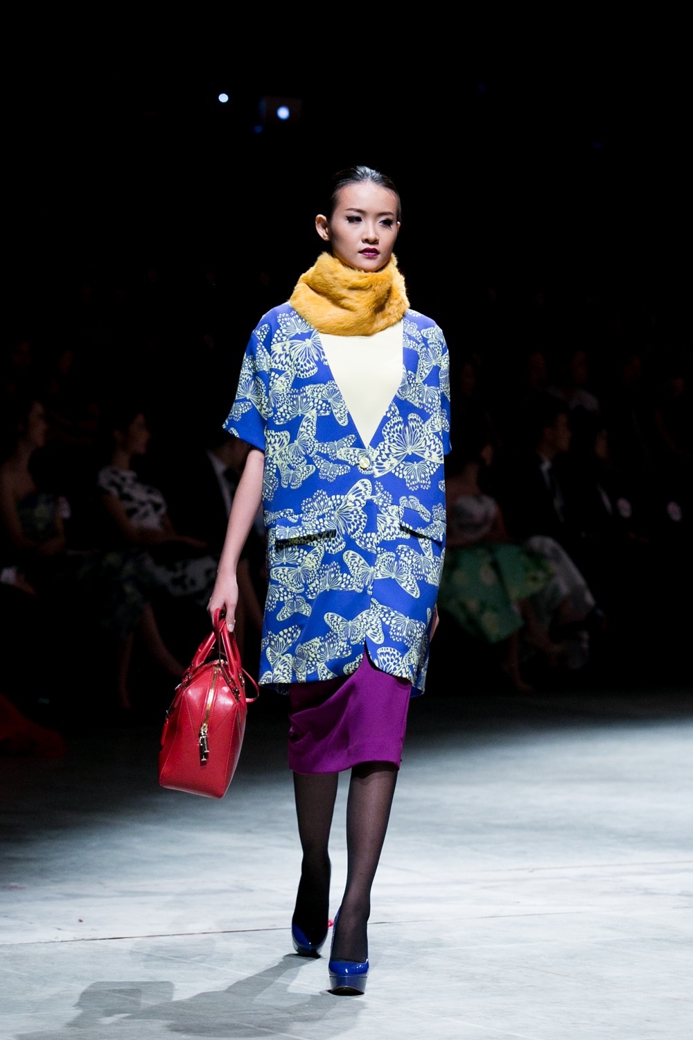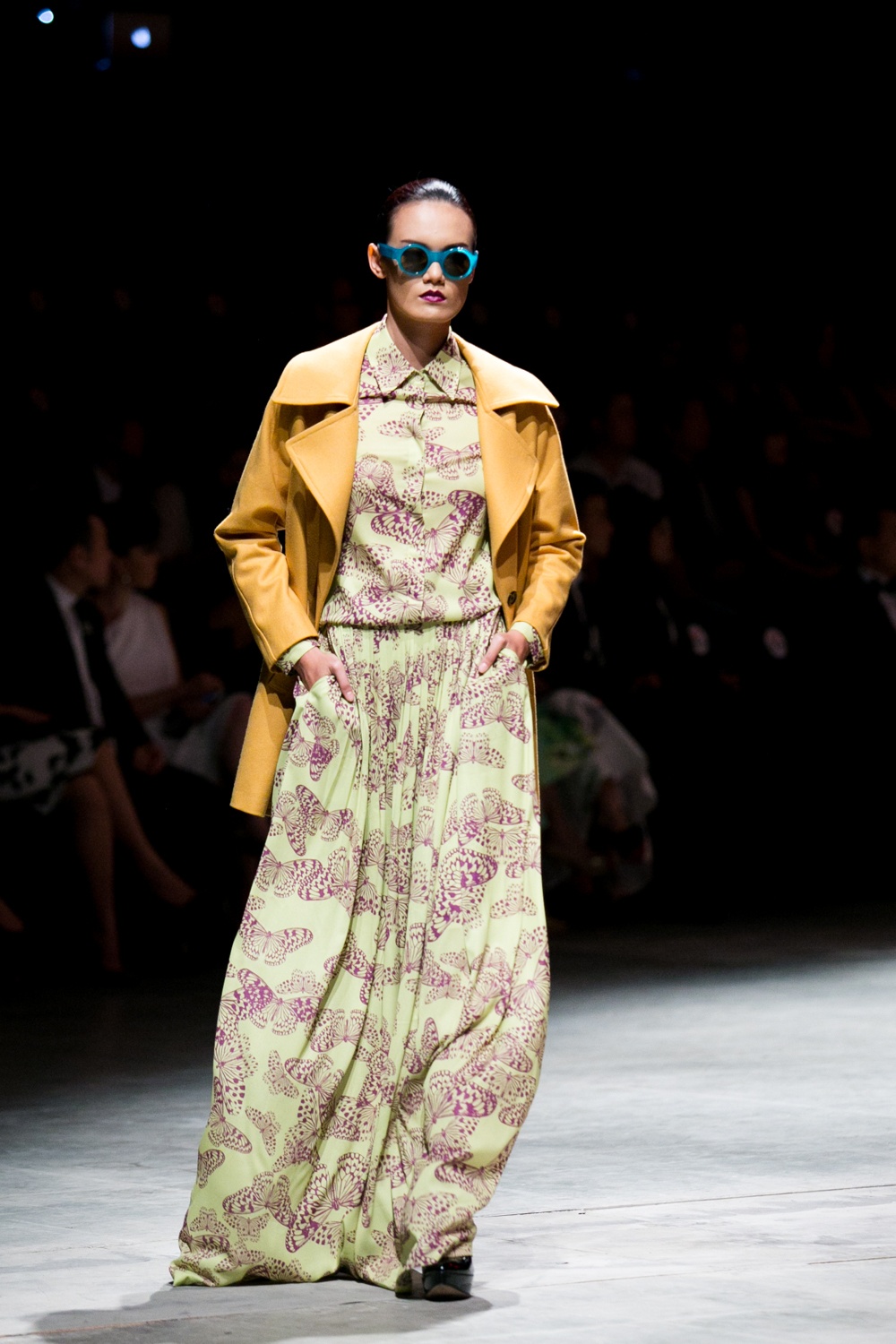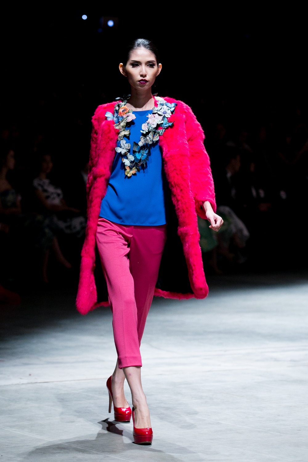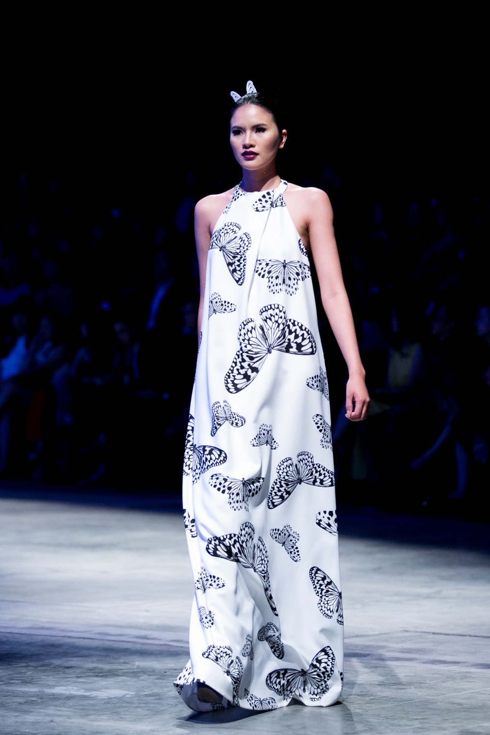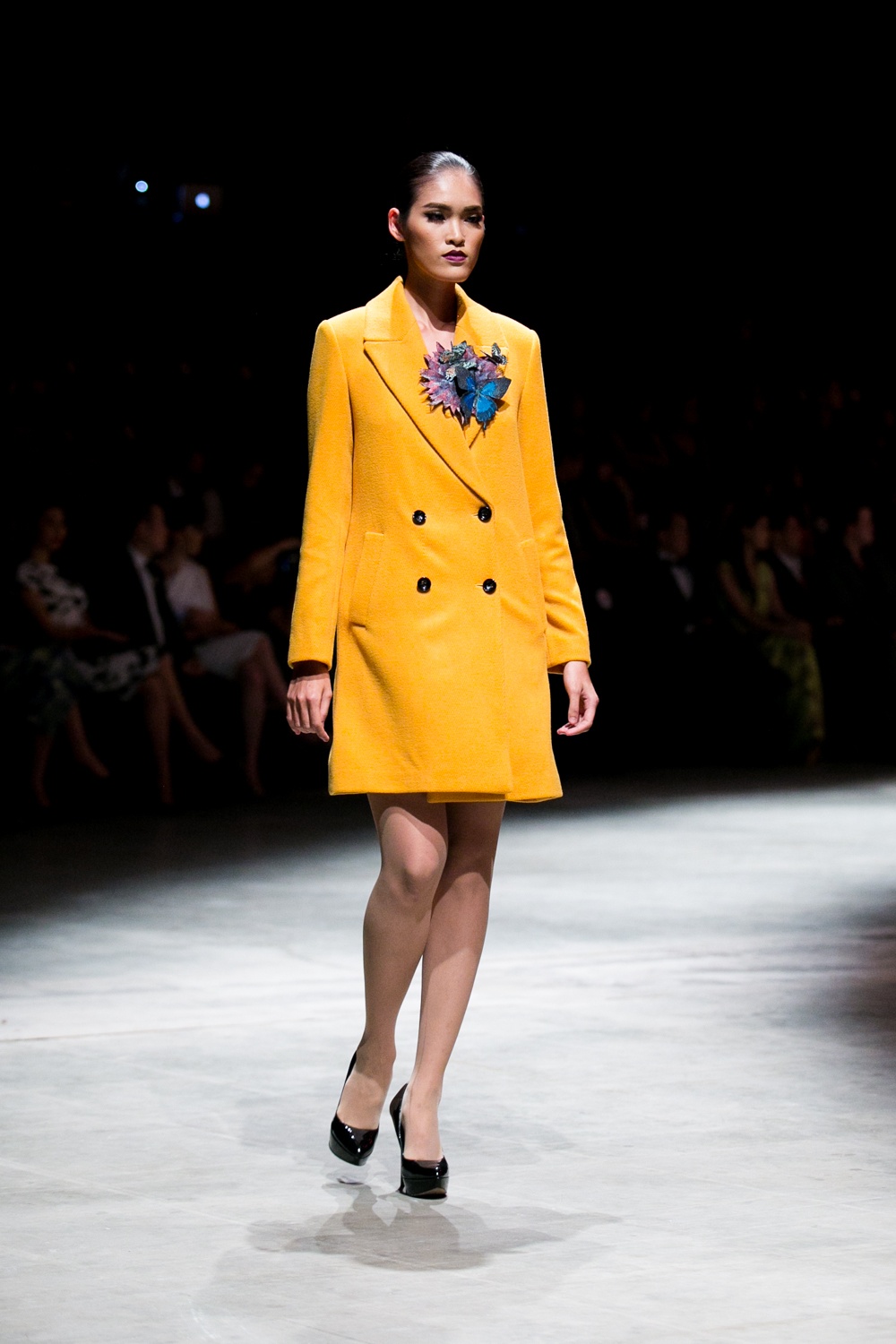 BST có sắc màu tươi trẻ được giới thiệu ở phần đầu khá ấn tượng với những mẫu váy thanh thoát, họa tiết bướm được xếp đặt có ý tứ trên từng mẫu váy có sự linh hoạt về màu sắc, tạo sự hài hòa cho từng mẫu thiết kế. Ngoài ra, phụ kiện giày, mũ, túi xách góp phần tô điểm cho BST có hơi thở mùa thu đông phương Nam.