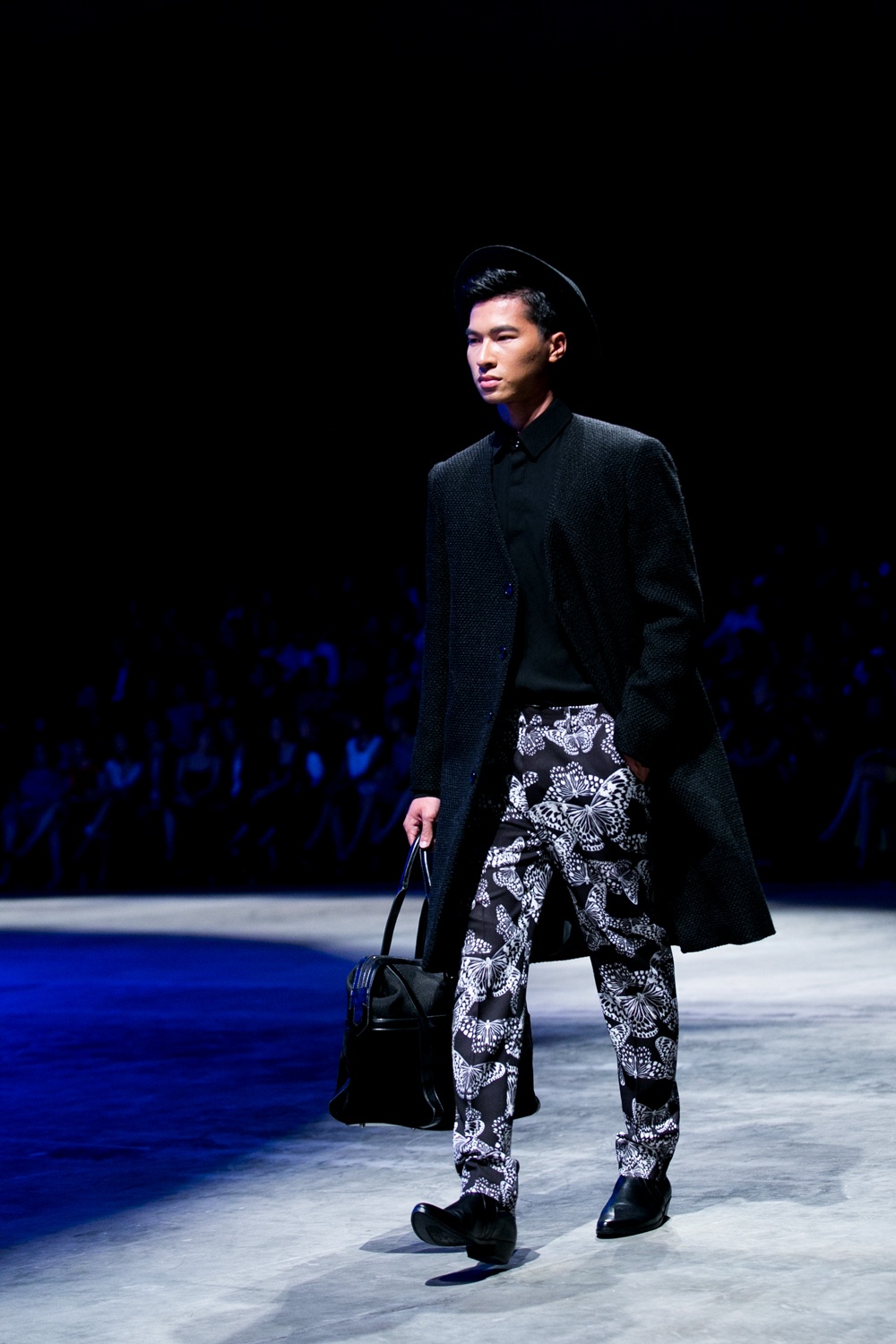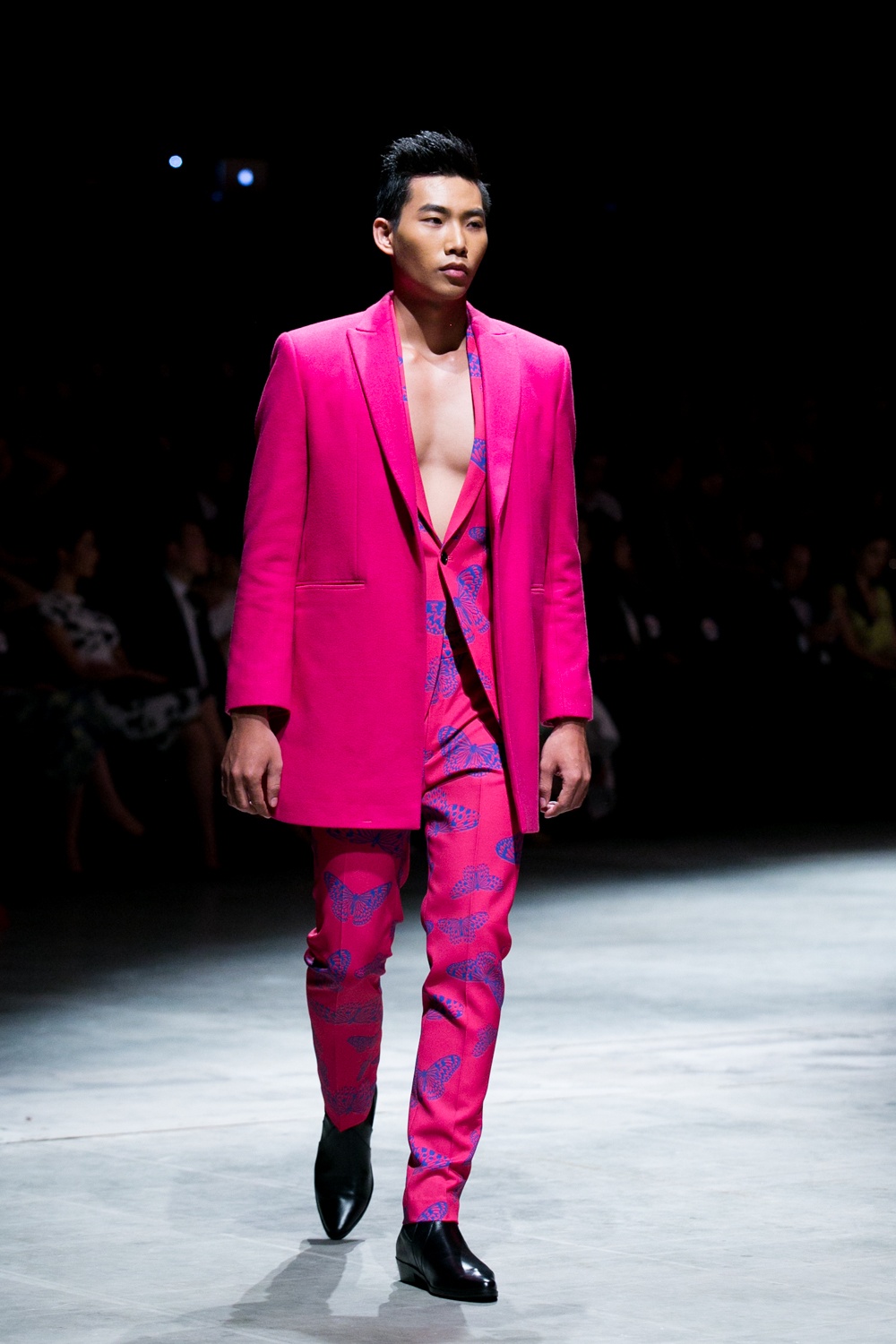 Người mẫu Hữu Long trình diễn một thiết kế dành cho nam có đường cắt xẻ táo bạo tại cổ áo. |