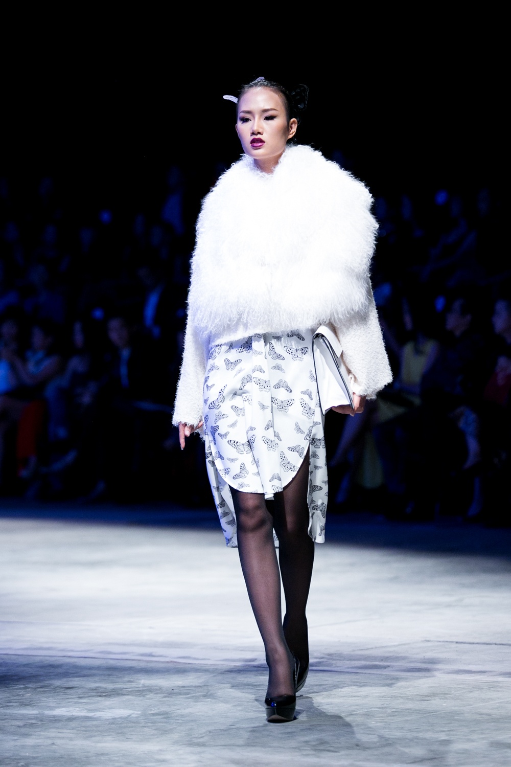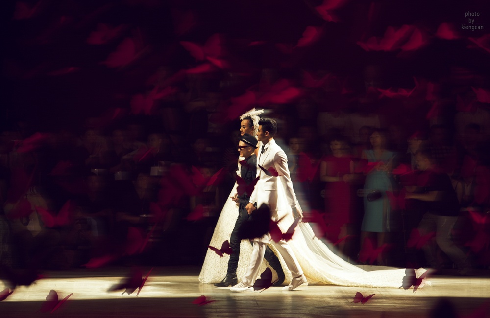 Đặc biệt, những cánh bướm không chỉ xuất hiện tràn ngập trên các thiết kế của người mẫu mà còn được nhà thiết kế bao phủ trên sân khấu chính. Được biết, Đỗ Mạnh Cường đã gắn đến 1.000 cánh bướm trên sân khấu hình tròn của mình.