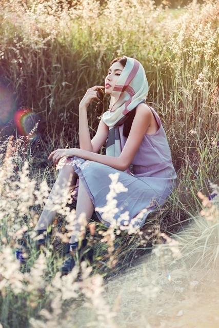 Đầm chiffron màu hồng phấn, xếp ly làm điểm nhấn, kết hợp với khăn lụa vuông, hoạ tiết đặc trưng.