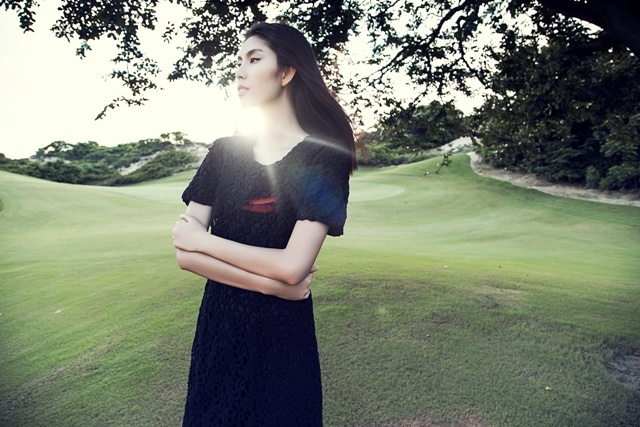 | Đầm ren màu nude và khăn lụa cổ điển. |