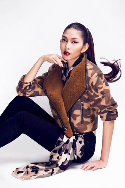 Áo khoác với phần cổ lớn nổi bật và khăn lụa hoạ tiết camo lạ mắt.