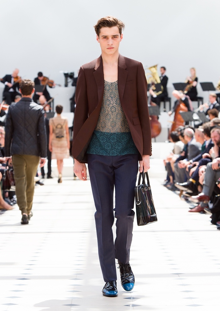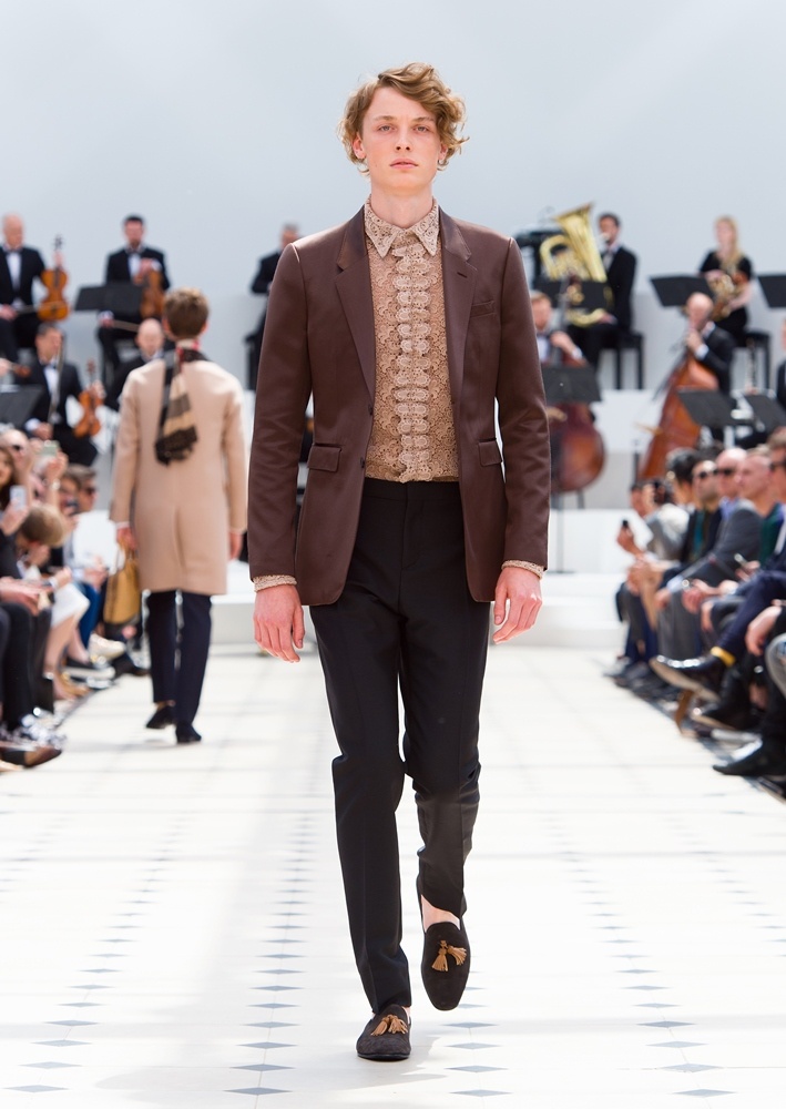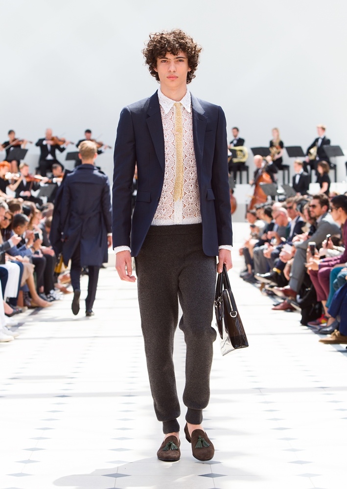 | Ở một phương diện khác, chất liệu ren vốn không là sự lựa chọn tiêu biểu của dòng thời trang nam cũng được Giám đốc sáng tạo Christopher Bailey sử dụng để khắc họa vẻ đẹp đối nghịch mềm mại và cứng cáp của từng lớp trang phục. |