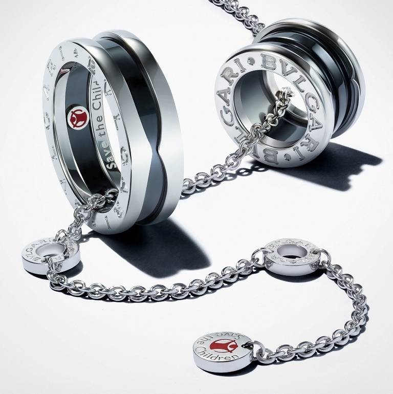 | Nhẫn và dây chuyền Bulgari có khắc logo tổ chức Save the Children. Mỗi sản phẩm bán ra, Bvlgari đóng góp 100 USD cho tổ chức này. Sản phẩm hiện có giá là 12,98 triệu đồng và bán tại cửa hàng Bvlgari trên toàn thế giới. Hơn 250 người nổi tiếng trên thế giới đã tham gia vào dự án đặc biệt này, thông qua ống kính của nhiếp ảnh gia nổi tiếng Fabrizio Ferri. |