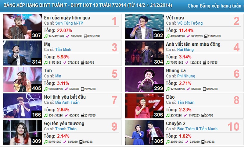 | Top 10 ca khúc trong BXH BHYT tuần 7 của năm. |