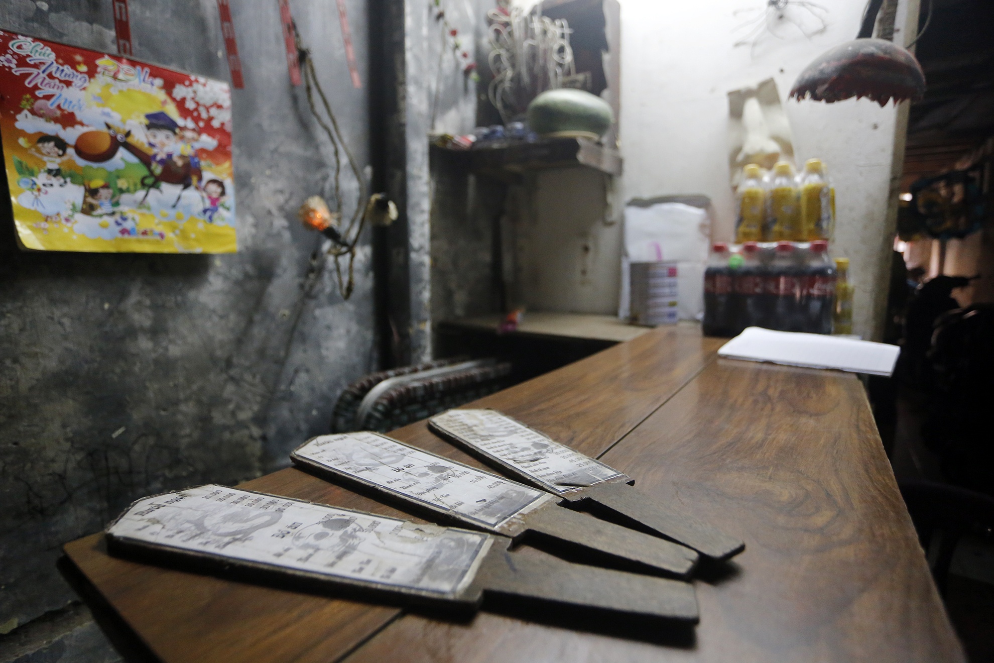 Menu độc đáo của quán được in trên gỗ, giống lệnh bài của thần chết được để ngay ở bàn phục vụ.